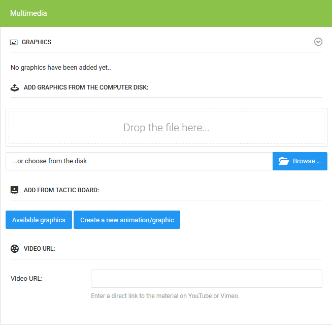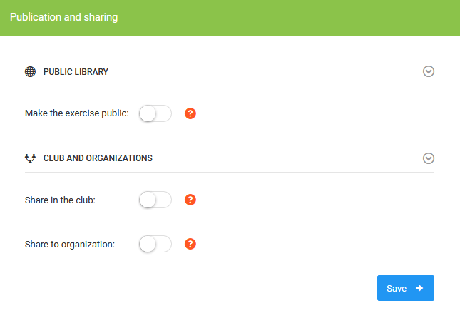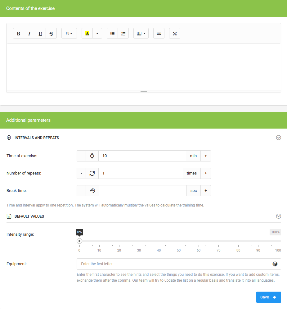 Процесс создания упражнения основан на дополнении нескольких элементов формы. Первый шаг - дать имя, указать место в библиотеке (папке) и указать конкретные теги упражнений (возрастная категория, тип и т.д.). Следующим шагом является добавление описания параметров упражнения и времени. Затем перейдите на вкладку мультимедиа, где вы добавляете графику в упражнение. У вас есть возможность добавить его с диска компьютера или из ранее созданного проекта, который был сохранен в частной библиотеке упражнений. В самом конце у вас есть возможность поделиться упражнением в клубе или публичной библиотеке.